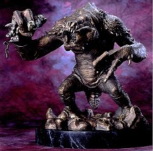 He Brings Death on a Dark Cloud; and His Name is Vengeance: Grazetta's Death Dealer Returns! In 1994, the undisputed master of fantasy art, Frank Frazetta and premier sculptor Randy Bowen came together to create a bronze translation of Frazetta's legendary Death Dealer. Over the years, the silent, brooding character of Frazetta's legendary painting had been captured on countless publications, posters, art books, magazines, plaques, and scores of other items. It has even been adopted by the U.S. Army Tank Corp. as mascot! Finally, through this very unique collaboration between these two talented artists and Dark Horse Comics, a three-dimensional bronze sculpture of the Death Dealer was born. Limited to only 50 bronzes, it sold out immediately and is now a coveted collectors' treasure that commands fantastic prices on the high-end collector's market. With special permission granted by the Frazettas, Dark Horse Comics and Bowen Designs are producing Frank Frazett's Death Dealer as a Cold-cast, limited-edition sculpture. The fully painted, meticulously detailed sculpture stands at 13 1/2" high and sits atop a dark mahogany base and includes burnished steel chains. Though slightly different, it remains exacting in every detail, this impressive peice captures the dark mystery and veiled menace that has captivated fantasy fans and collectors worldwide. The Death Dealer is limited to 5,000 copies. Each statue is individually numbered and comes in an elegant full-color collector's box. The Death Dealer will be available December 1997 for a suggested retail price of $250.00. To preview this special project, check out the Dark Horse website: http://www.dhorse.com or the Bowen Designs website: http://www.teleport.com/~bowen8r. |